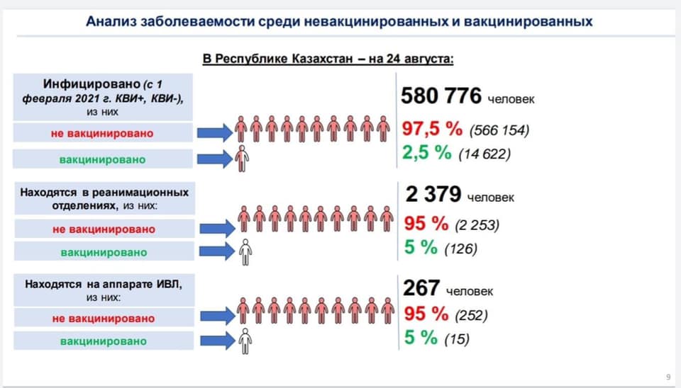 Аналогичная ситуация складывается и с тяжелым течением КВИ, где 95% находящихся в реанимации и искусственной вентиляции легких приходится также на невакцинированных.