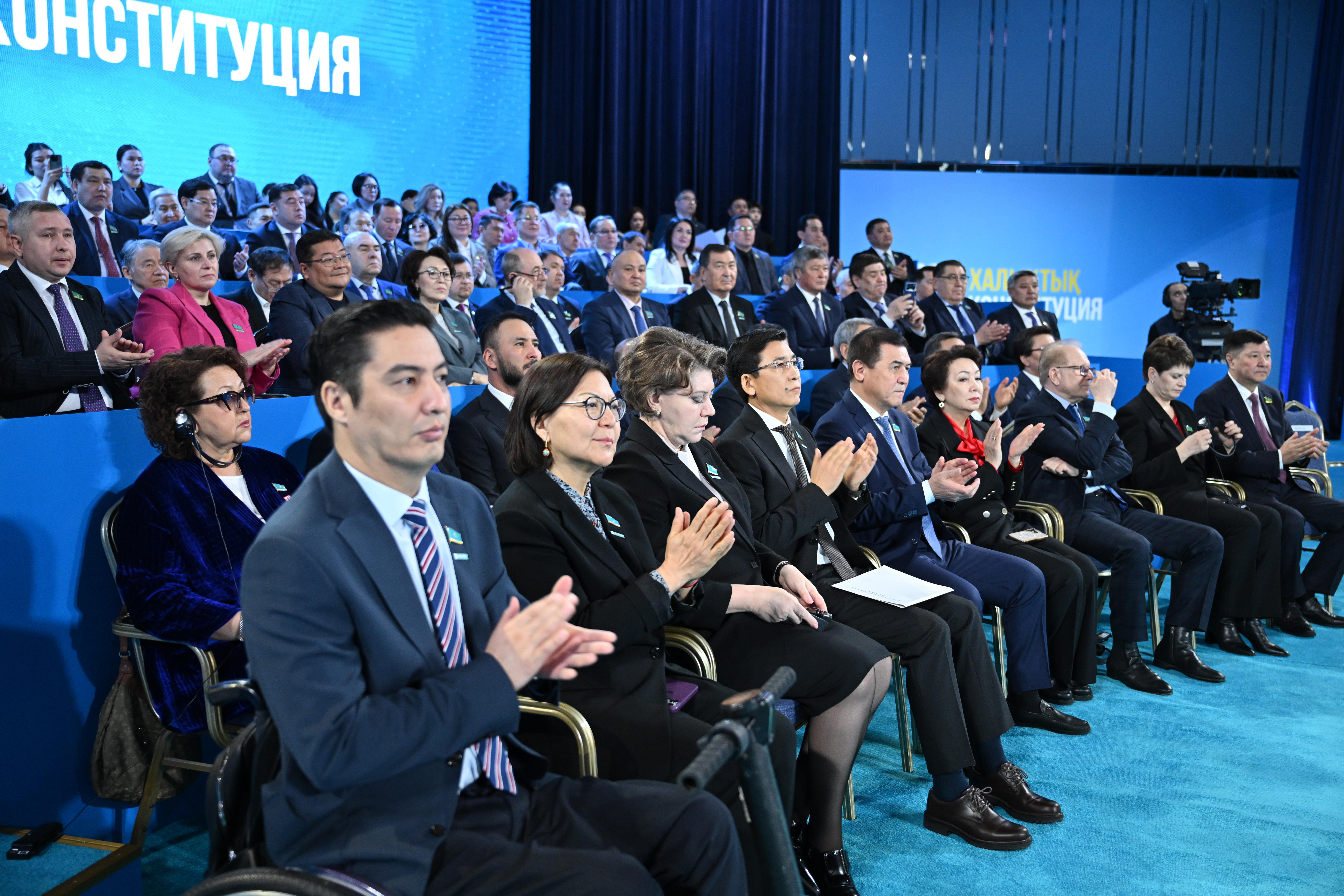 ء«بىز جاڭا اتا زاڭمەن جاڭا داۋىرگە قادام باسقالى وتىرمىز. بۇل – مىڭداعان جىلدىق تاريحتىڭ تىنىسى سەزىلىپ تۇرعان كونستيتۋتسيا. جاستاردىڭ رۋحى جالىنداپ تۇرعان كونستيتۋتسيا. حالىقتىڭ ءۇنى جاڭعىرىپ تۇرعان كونستيتۋتسيا. جاڭا كونستيتۋتسيادا پرەزيدەنتتىڭ وزىندىك قولتاڭباسى، ومىرلىك ۇستانىمى مەن رەفورماتورلىق ءستيلى ايقىن اڭعارىلىپ تۇر. مەملەكەت باسشىسى بار ءبىلىمىن، مول تاجىريبەسىن، بۇكىل كۇش-جىگەرىن ەلىنە، حالقىنىڭ بولاشاعىنا ارناپ كەلە جاتقانىن ايتۋعا ءتيىسپىز»، – دەدى ول.