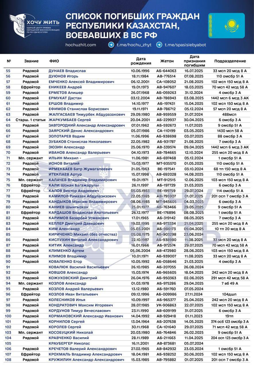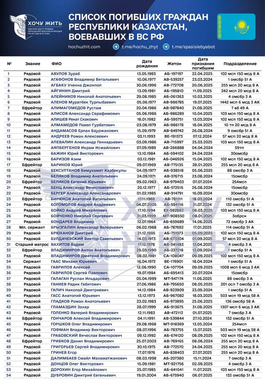 Украиналық "Хочу жить" жобасы Украинада Ресей әскері қатарында соғысып, қаза болды деген қазақстандықтардың тізімін жариялады, деп хабарлайды “Адырна”.