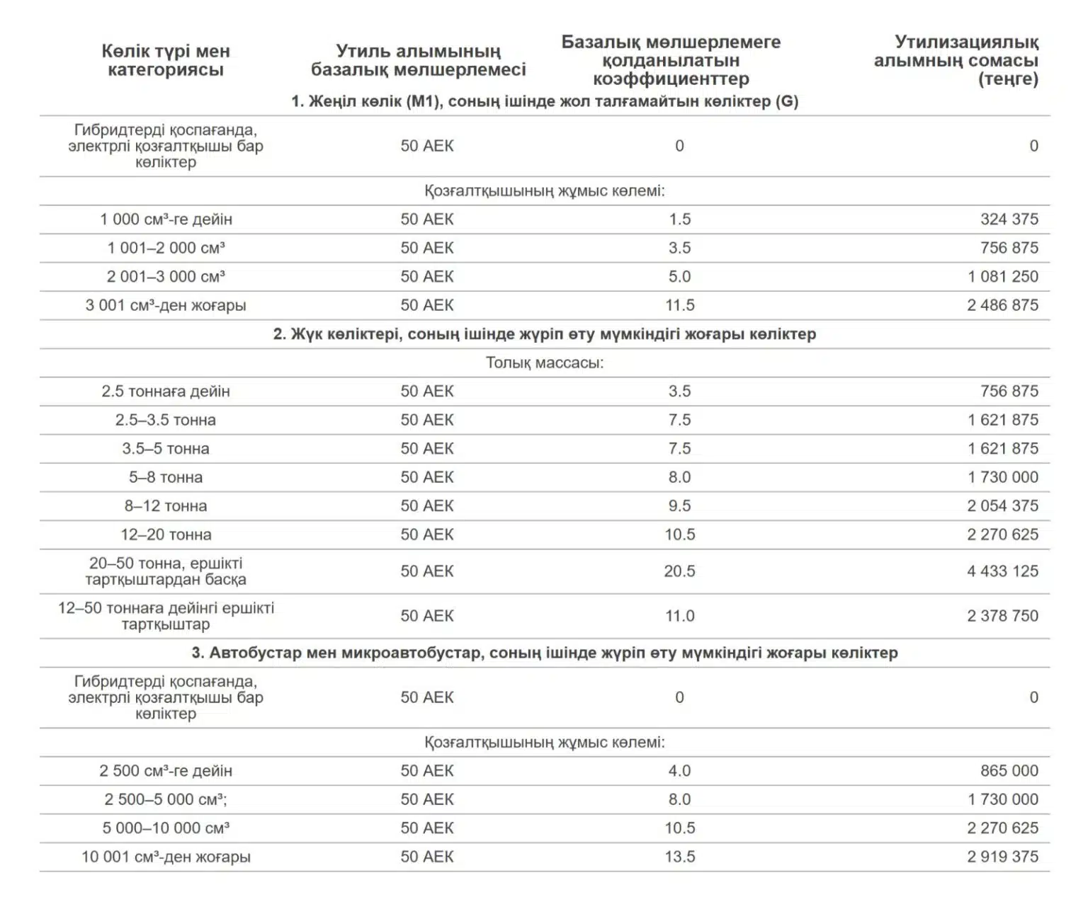 2026 жылы автокөлікті бастапқы тіркеуге дейін төленуі тиіс утилизациялық алым айлық есептік көрсеткіш мөлшерінің өсуіне байланысты көбейеді. Яғни, утилизациялық алымның базалық мөлшерлемесі (50 АЕК) көтеріліп, 196 600 теңгеден 216 250 теңгеге дейін өседі. Бұл туралы  kolesa.kz жазды, деп хабарлайды "Адырна".
