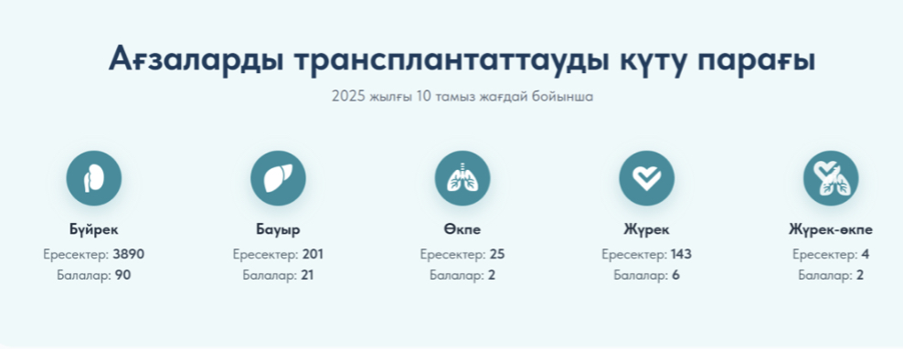 2025 жылғы 10 тамыздағы мәлімет бойынша, елімізде 4 384 адам трансплантацияны күтіп отыр. Олардың ішінде 3890 ересек пен 90 бала бүйрекке, 201 ересек пен 21 бала бауырға мұқтаж. Ал жүрек пен өкпе күтетіндер саны жүзден асады. 2024 жылы 335 адам қажетті ағзасына қол жеткізе алмай көз жұмды. Бұл сандардың артында адамдардың тағдыры, ата-ананың үміті, балалардың болашағы тұр.