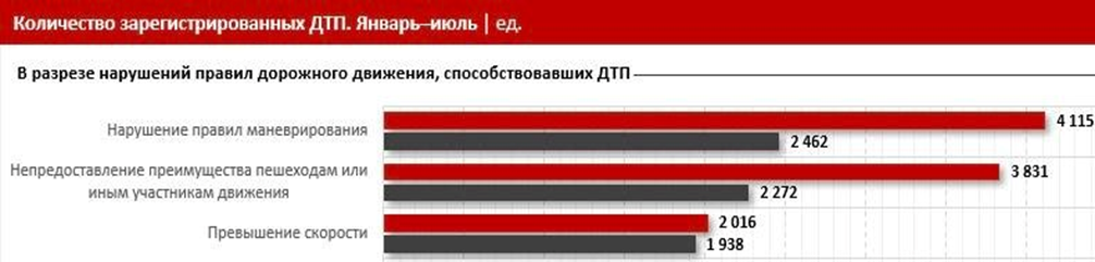 Жүргізушілердің қауіпсіздік талаптарын елемейтіндері, ресми деректерден көрініс табады. Жол ережесін бұзудың 70%-дан астамы арнайы камералар арқылы тіркеледі, ал патрульдік көліктерге орнатылған радар саны 456-ға жеткен. Дегенмен, Ішкі істер министрлігінің мәліметінше, жыл сайын елімізде 13 миллионнан астам жол ережесін бұзу фактісі тіркелген. Апатқа себеп болатын негізгі заң бұзушылық факторлар қатарында: