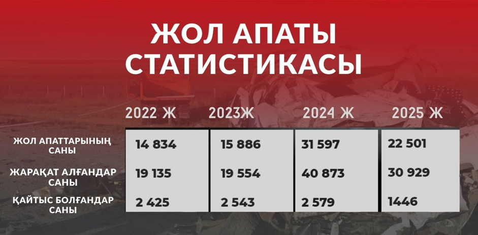 Төрт жылдың ішінде Қазақстан жолдарында он мыңға жуық адам қаза тауып, жараланғандар саны да жыл сайын артып келеді. 2025 жылы жол-көлік оқиғалары 2023 жылмен салыстырғанда екі есе көбейіп, 22 501-ге жетті.