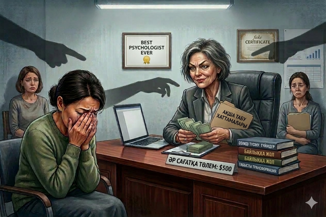 «Тек Астана қаласы бойынша Kaspi қосымшасындағы хабарландыруларды зерделегенімізде, психологиялық қызмет ұсынып отырған 365 адамды анықтадық. Олардың баға саясаты ешқандай логикаға сыймайды: қарапайым кеңес 5 мың теңгеден басталса, кейбір “мамандардың” бір сағаттық қабылдауы миллион теңгеге дейін жетеді. Ең өкініштісі – бұл адамдардың көбінде арнайы жоғары білімі жоқ. Олар небәрі 34 сағаттық қысқа курсты бітіріп, қолдарына тиген жылтырақ сертификатты дипломмен тең көреді. Мұндай “мамандар” адам жанының терең иірімдерін түсінбек түгілі, психологияның қарапайым этикасы мен шекарасын да білмейді», - дейді маман.