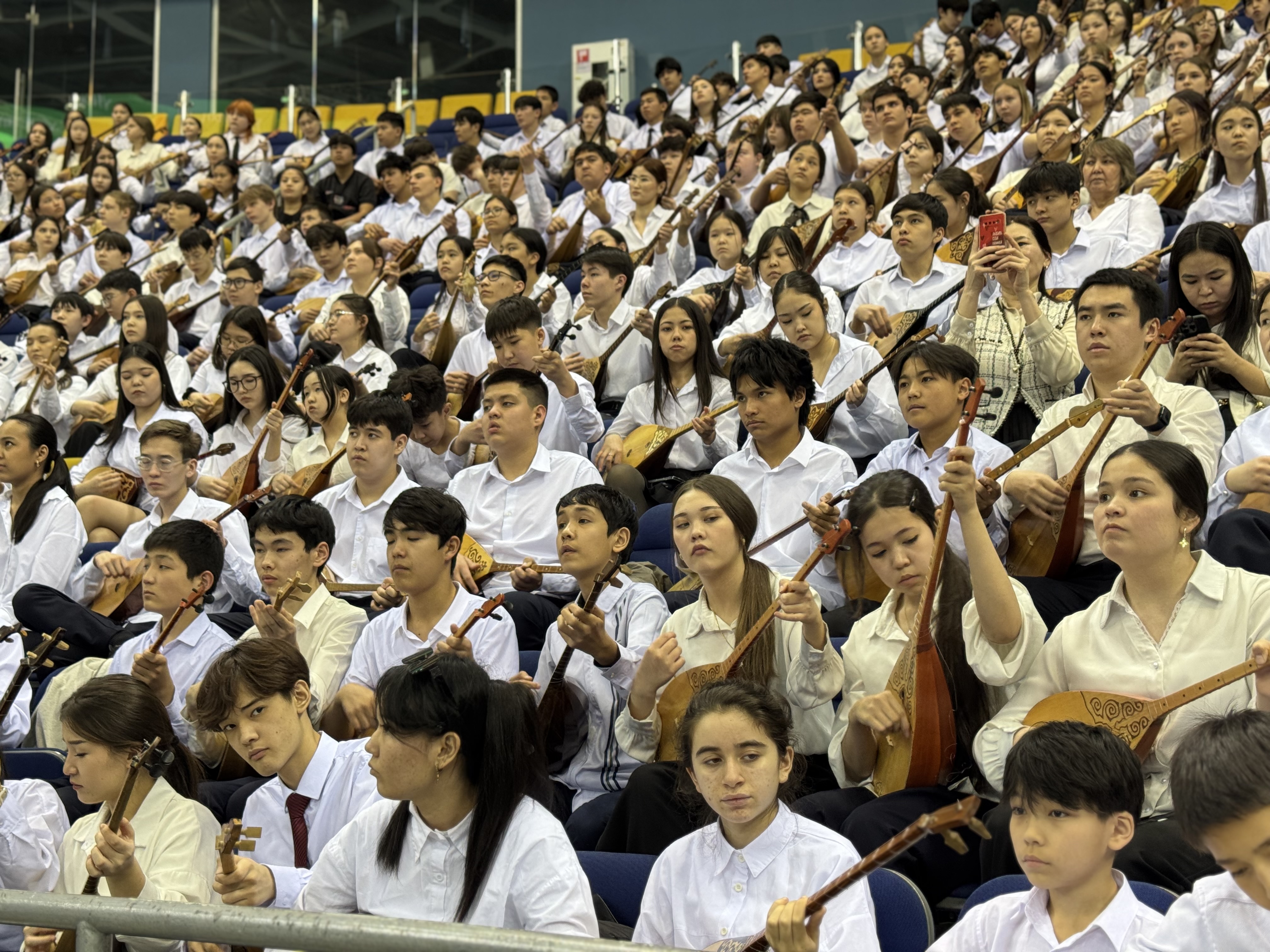 Belgılengen uaqytta 11 000 oquşy bırıkken orkestr qūramynda arnaiy daiyndalǧan muzykalyq popurridı bır mezette oryndady. Myŋdaǧan dombyra ünı bır arnada ündesıp, Qazaqstannyŋ jas buynynyŋ bırlıgı men ruhani tūtastyǧyn aiqyn körsettı. Auqymdylyǧy, oryndauşylardyŋ şeberlıgı jäne ūlttyq mädenietke degen qūrmet üilesken būl körınıs körermender men qonaqtarǧa erekşe äser qaldyrdy.