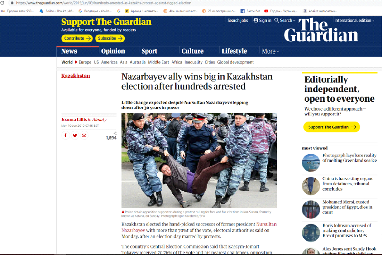 Вот статья с сайта «The Guardian» которая была написана 10-го июня. Вице-министр внутренних дел Марат Кожаев сообщил о 500 задержанных в Астане и Алматы, в том числе, среди задержанных был британский журналист из агетства «France-Presse» Крисс Риклтон, у которого поврежден глаз в шествии митинга. (Chris Rickleton, a British journalist with Agence France-Presse, was briefly detained and sustained a black eye during his arrest).