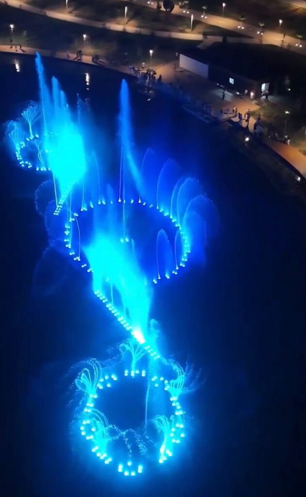 Семь контуров фонтана работают синхронно: каждый — с уникальной динамикой и цветовой схемой на светодиодах. Система позволяет создавать сложные хореографии воды и света под музыку.