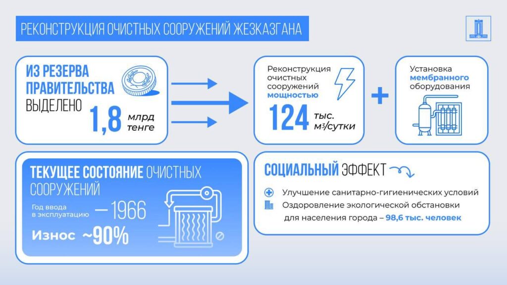 В рамках реализации поручений Главы государства Касым-Жомарта Токаева по обеспечению населения качественной питьевой водой из резерва Правительства выделено порядка 1,8 млрд тенге для реконструкции хозяйственно-питьевых очистных сооружений г. Жезказгана. Соответствующее постановление подписано Премьер-министром Олжасом Бектеновым. Средства направлены на реализацию второй очереди проекта по полной реконструкции существующих очистных сооружений Жезгазгана мощностью 124 тыс. мᶾ/сутки, с установкой мембранного оборудования, которая позволит провести модернизацию хозяйственно-питьевого очистного сооружения. Вопрос реализации данного проекта является социально значимым для населения города Жезказгана. Водоснабжение областного центра осуществляется с Кенгирского водохранилища. Хозяйственно-питьевые очистные сооружения города введены в эксплуатацию в 1966 году. Износ оборудования и технологий составляет порядка 90%. Выделение финансовых средств позволит продолжить оздоровление социально-экологической обстановки и повышение санитарно-гигиенического уровня жизни населения города Жезгазган, которое на сегодняшний день составляет 93,3 тыс. человек.