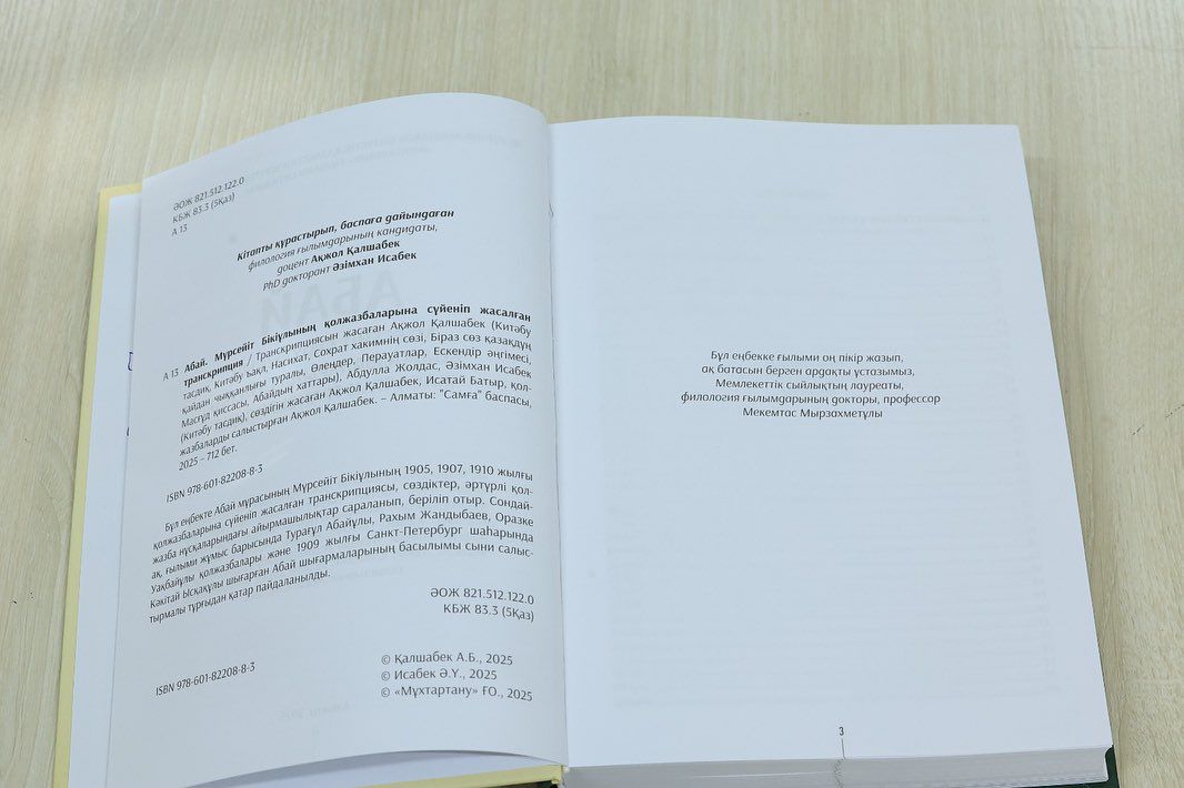 م.اۋەزوۆ اتىنداعى وڭتۇستىك قازاقستان ۋنيۆەرسيتەتىنىڭ «مۇحتارتانۋ» عىلىمي-زەرتتەۋ ورتالىعى حاكىم ابايدىڭ 180 جىلدىعىنا وراي «اباي. مۇرسەيىت قولجازبالارىنا سۇيەنىپ جاسالعان ترانسكريپتسيا» اتتى جاڭا عىلىمي ەڭبەكتى جارىققا شىعاردى.