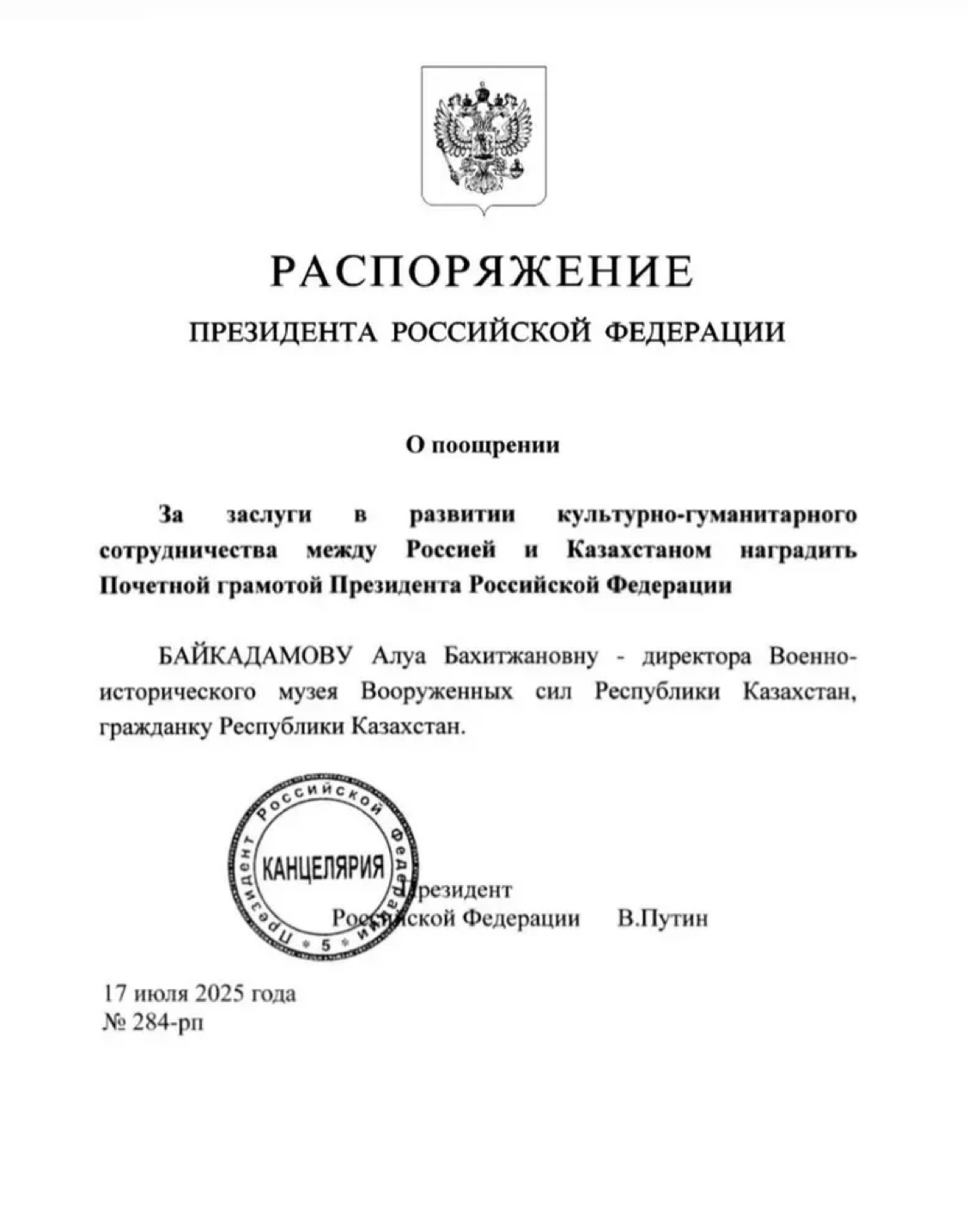 رەسەي فەدەراتسياسى پرەزيدەنتىنىڭ 2025 جىلعى 17 شىلدەدەگى № 284-رپ "ماراپاتتاۋ تۋرالى" وكىمىنىڭ تولىق نۇسقاسى "قۇقىقتىق اكتىلەردىڭ رەسمي جاريالانىمى" سايتىندا جاريالاندى.