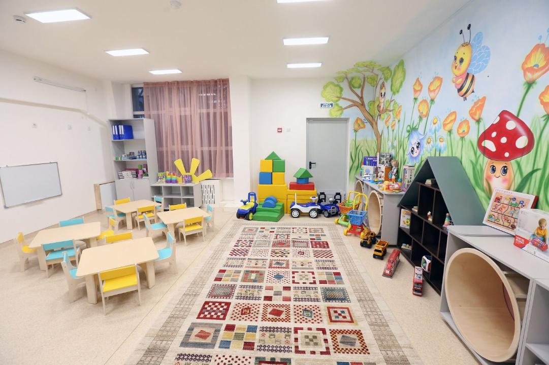 ەكى قاباتتا ءارتۇرلى جاس توپتارىنا ارنالعان توپتىق بولىمدەر ورنالاسقان. ءار توپتىڭ جانىندا كيىم شەشەتىن بولمە، جاتىن بولمە، بۋفەت جانە سانيتارلىق توراپ قاراستىرىلعان. قوسىمشا ساباقتار مۋزىكالىق زالدا وتكىزىلەدى.