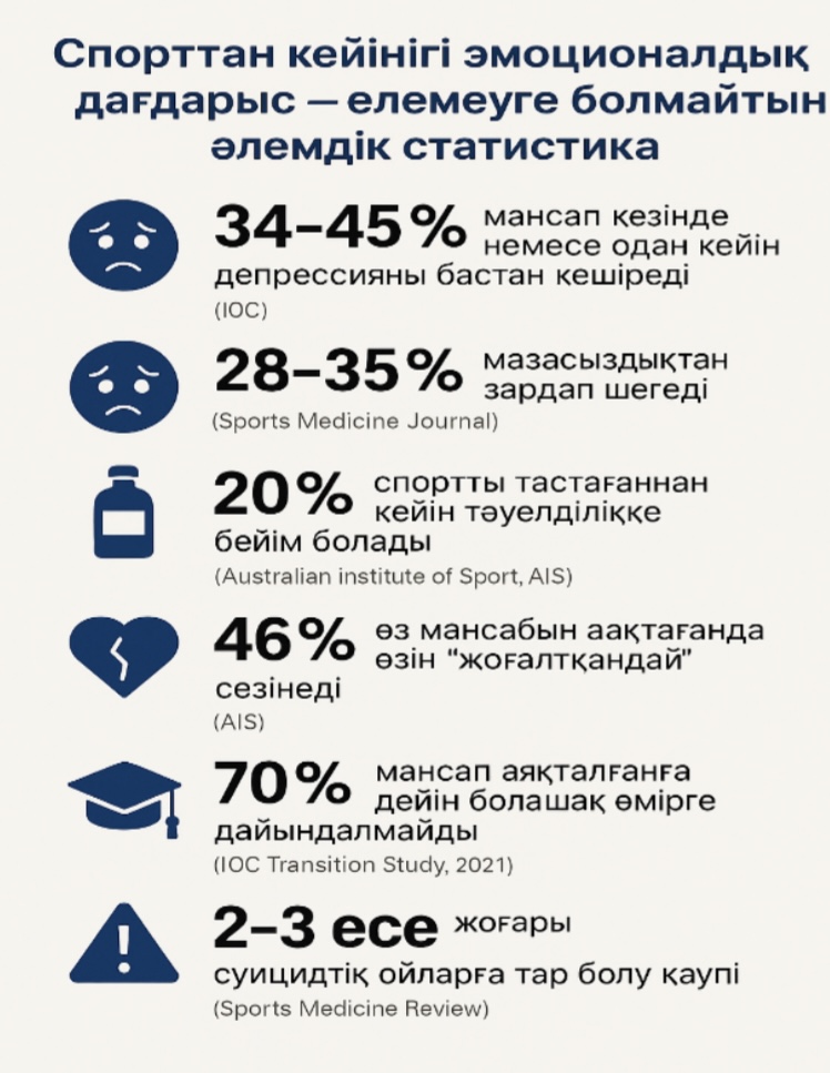 Халықаралық Олимпиада комитетінің 2021 жылғы зерттеуі тағы бір маңызды фактіні алға тартады: спортшылардың 70% мансап аяқталғанға дейін болашақ өміріне дайындық жүргізбейді. Яғни, адамдар жылдар бойы тек спортқа бағытталғандықтан, кейінгі кәсіби жолы туралы ойлауға уақыт таппайды. Сол себепті өтпелі кезең өте ауыр өтеді. Sports Medicine Review деректеріне сүйенсек, кәсіби спортшылардың суицидтік ойларға тап болу қаупі жалпы халыққа қарағанда 2–3 есе жоғары. Бұл көрсеткіш спорттағы психологиялық қиындықтардың қаншалық терең екенін ашады.