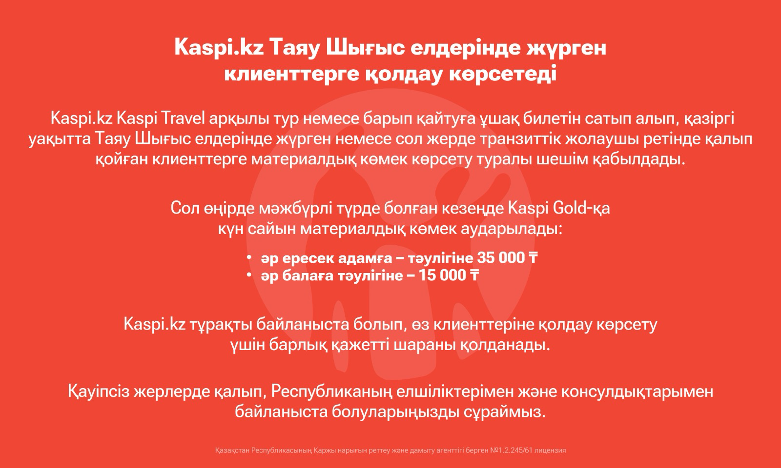 Kaspi.kz Kaspi Travel арқылы тур немесе барып қайтуға ұшақ билетін сатып алып, қазіргі уақытта Таяу Шығыс елдерінде жүрген немесе сол жерде транзиттік жолаушы ретінде қалып қойған клиенттерге материалдық көмек көрсету туралы шешім қабылдады.