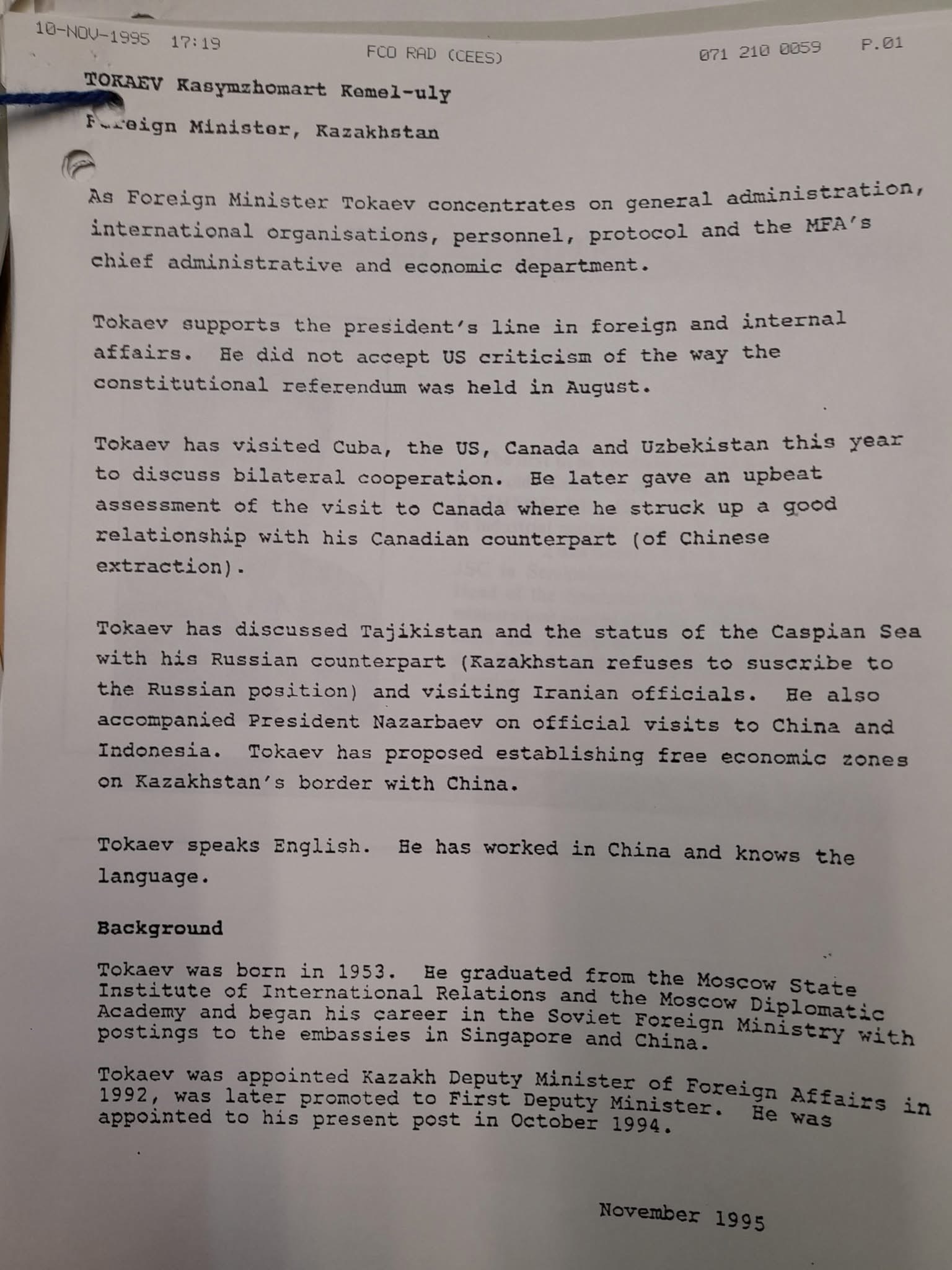 Ұлыбритания архивіндегі Тоқаев туралы құжаттар жарияланды