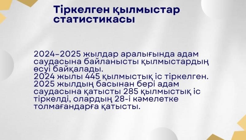“Қайсар” қорының жетекшісі Оксана Тарабукинаның ұсынған статистикалық деректерінде 2024 жылы – 445, ал 2025 жылдың басынан шамамен тамыз айларына дейін 285 қылмыстық істің тіркелгені көрсетілген.