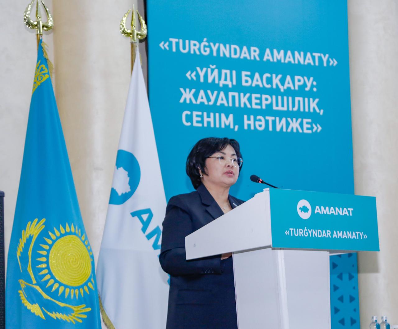 Жиында «AMANAT» партиясының Хатшысы Шолпан Каринова «TURGYNDAR AMANATY» жобасы көппәтерлі тұрғын үйлерге қатысты қордаланған мәселелердің оң шешімін табуға бағытталғанын айтты. Жоба аясында МИБ және ПИК төрағаларын оқыту, депутаттармен кері байланысты күшейту, әкімдіктермен бірлескен жұмысты жолға қою, аулаларды абаттандыру және «Халық қатысатын бюджет» тетігін кеңінен пайдалану көзделіп отыр. Бұған дейін ел аумағындағы бірнеше өңірде дәл осы бағыттағы жүйелі жұмыс жүргізілді. Мәселен, төрт айда Астанада ашылған жобалық фронт-офисте 114 өтініш қабылданып, 67 мәселе бойынша кеңес берілген.