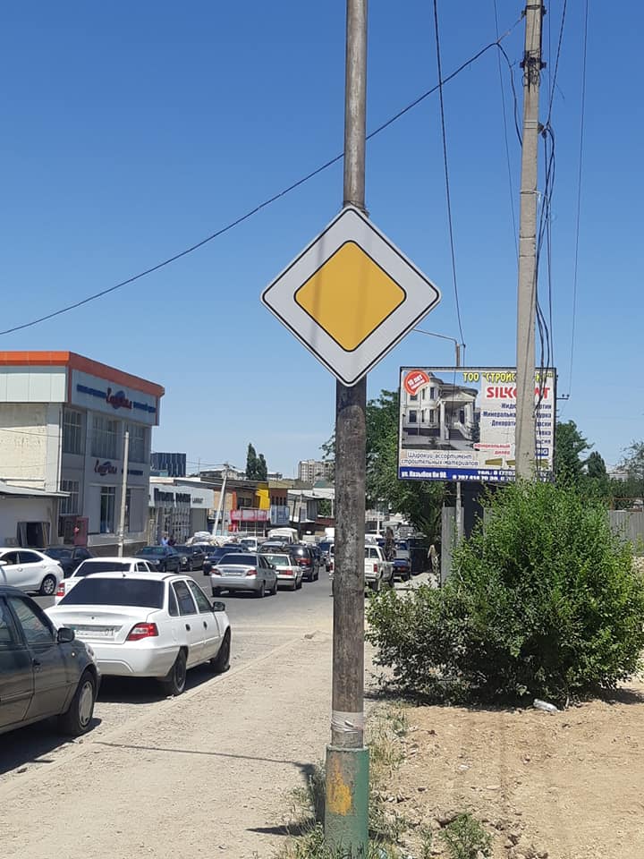 Шымкент қаласының кейбір көшелерінде жол белгілері электр бағаналарына орнатылған. Бұл туралы журналист Рүстем Ашетаев хабарлап, суреттерін желіге жариялады. "Мынандай жол белгілерінің "астынан" полиция ұстап алса, төлеуім қаншалықты заңды? Шымкент қаласының "Старый город" базарын кесіп өтетін жолдың бойында электр бағаналарына  орнатылған жол белгілері бар. Менің білуімше мұндай белгілерді арнайы мекемелер тапсырыспен өзінің стандартына сай, арнайы бағаналарға орнатады. Сол белгілер заңды болып саналады. Әкімшіліктің  мынандай жол белгілеріне тапсырыс бергеніне күмәндімін. Сонда, тапсырыс берушілер осылай қабылдап алған ба?"  Мұндай (жарық, электір т.б) бағаналарға орнатылған белгілерді қаланың басқада көшелерінен көп кездестіруге болады. Мысалы, Бәйдібек көшесінің бойындағы көкөніс базарының маңындағы жарық бағаналарынан кездестіреміз.