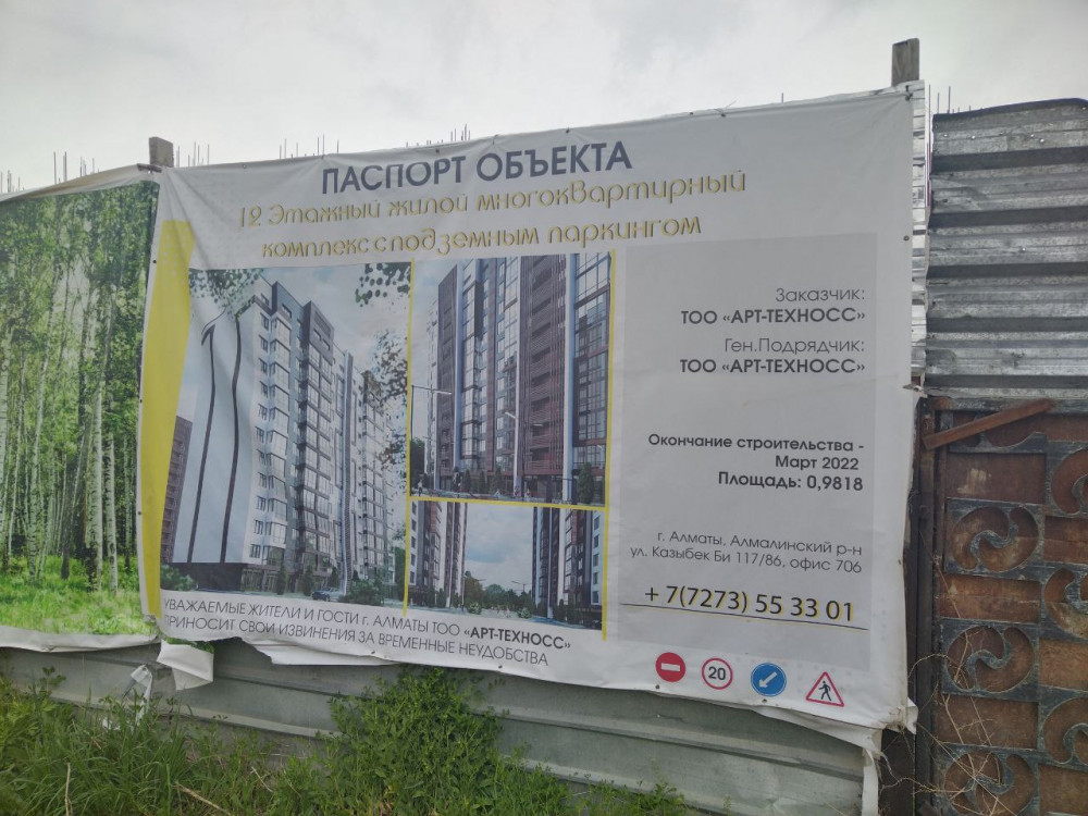 2021 jyldyŋ nauryzynda üidıŋ qūrylysy bastaldy, jospar boiynşa jeltoqsanda salynyp bıtuı kerek bolǧan. Aiyna ekı qabattan köteru közdeldı, iaǧni 12 qabatty üidı alty aida salyp bıtıruımız qajet bolǧan. Qūrylys ekı ai jürdı, keiın toqtatyp tastady. Aldymen Almaty qalasy Qala qūrylysyn baqylau basqarmasynyŋ adamdary kelıp qūrylys zaŋsyz dedı. Qūjattarymnyŋ barlyǧy ornynda, tek Säulet-josparlau tapsyrmasyn (SJT) bermei jatqanyn aittym. Sol sebeptı olar maǧan aiyppūl saldy. Ekı ret 291 myŋ teŋgeden töledım. SJT-ny säulet bölımı beru kerek, solar bermei otyr,-deidı qūrylys kompaniiasynyŋ iesı M.Abitov.Säulet basqarmasy qūrylysty rūqsatsyz salyp jatyrsyŋdar degen uäj aitqan. Bıraq kompaniia olarǧa 9 ret hat jazyp, mardymdy jauap ala almaǧandaryn aitady.