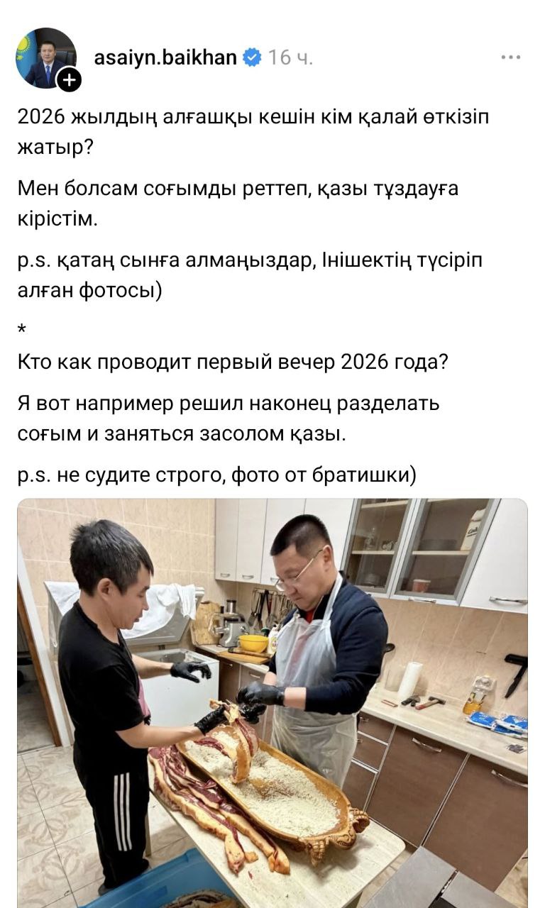 Pavlodar oblysynyŋ äkımı Asaiyn Baihanov äleumettık jelıde qazyny tūzdap jatqan suretın jariialap, Jaŋa jyldy qalai qarsy alǧanyn jazdy, dep habarlaidy “Adyrna”.