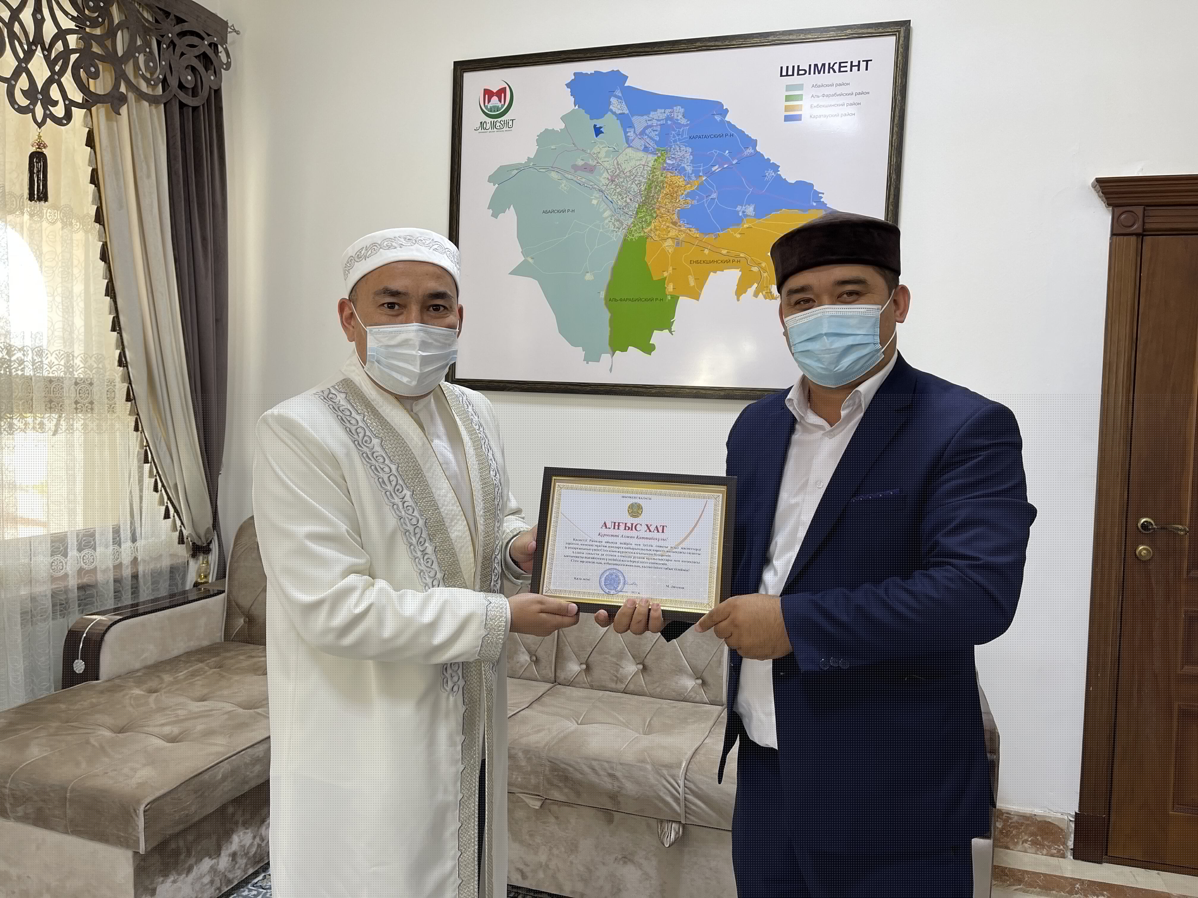 Қала әкімінің арнайы жолдаған алғыс хатын Шымкент қаласының бас имамы Бақдәулет Абдрахманов табыс етіп, ел Тәуелсіздігінің 30 жылдығы мен «Шымкент – қайырымды қала» жобасы аясында аянбай қызмет етуге шақырды.