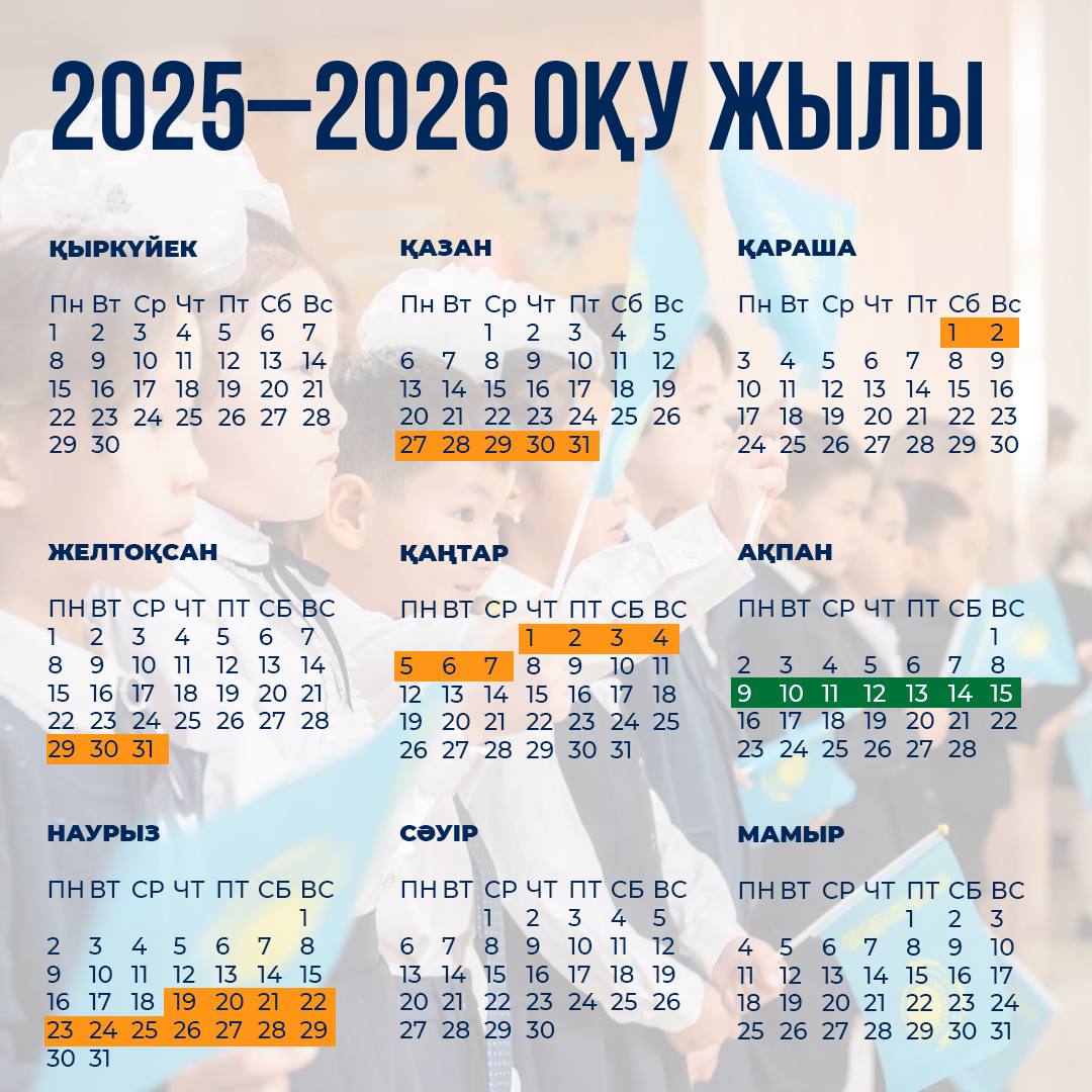 مينيسترلىكتىڭ مالىمەتىنشە، وقۋ پروتسەسى 2025 جىلعى 2 قىركۇيەكتە باستالىپ، 2026 جىلعى 25 مامىردا اياقتالادى. ءبىلىم كۇنىنە ارنالعان سالتاناتتى جيىننىڭ ۋاقىتى مەن كۇنى مەكتەپتىڭ پەداگوگيكالىق كەڭەسىنىڭ شەشىمىمەن بەلگىلەنەدى.