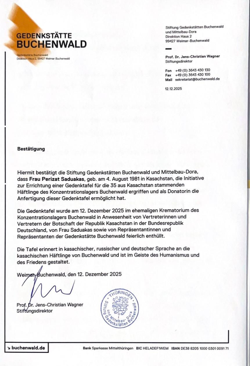 بۋحەنۆالد باسشىلىعى قازاقستاندىق تۇتقىنداردىڭ ءتىزىمىن انىقتاۋ باستاماسى پەريزات سادۋاقاسقا تيەسىلى ەكەنىن راستايتىن رەسمي سەرتيفيكات تابىستادى. بۇل قۇجات اۆتورلىق قۇقىقتىڭ بالاماسى رەتىندە قاراستىرىلادى.