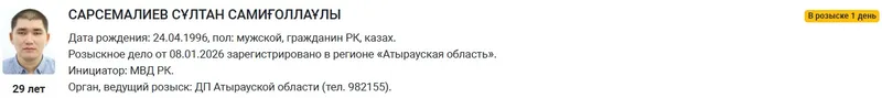 قۇقىقتىق ستاتيستيكا جانە ارنايى ەسەپكە الۋ ورگاندارىنىڭ پورتالىندا ورنالاستىرىلعان ىزدەستىرۋ اقپاراتىنا سايكەس، اتىراۋ وبلىسىندا وتباسى مۇشەلەرىن ءولتىردى دەگەن كۇدىكپەن ىزدەۋدە جۇرگەن ەر ادام – سارسەماليەۆ سۇلتان ساميعوللاۇلى، 1996 جىلى دۇنيەگە كەلگەن، قازاقستان رەسپۋبليكاسىنىڭ ازاماتى.