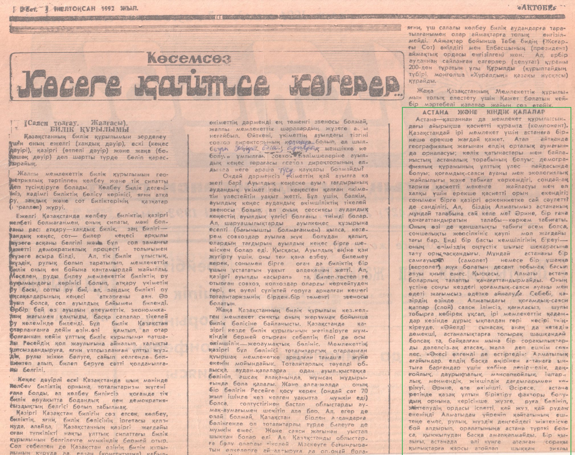 استانانى ورتالىققا كوشىرۋ، سولجەنيتسىننىڭ ايگىلى "كاك وبسترويت روسسيۋ" دەگەن ساندىراعىنا قارسى جاۋاپ رەتىندە "كوسەگە قايتسە كوگەرەر" ماقالامدا كەلتىرىلگەن-ءدى.