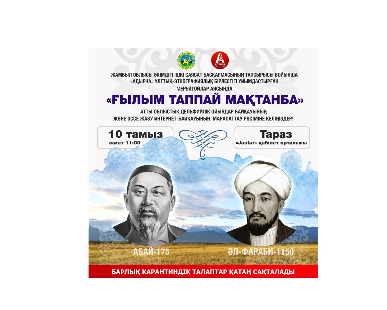 قۇرمەتتى وقىرماندار! جامبىل وبلىسى ىشكى ساياسات باسقارماسى مەن "ادىرنا" ۇلتتىق-ەتنوگرافيالىق بىرلەستىگى "عىلىم تاپپاي ماقتانبا" جانە «ماڭگىلىك ەلدىڭ الىپتارى» اتتى شىعارماشىلىق بايقاۋلارىن جاريالاعان ەدى. بەس نوميناتسيادان تۇراتىن بايقاۋدىڭ قورىتىندىسى انىقتالدى. قازىلار القاسىنىڭ شەشىمىمەن انىقتالعان جۇلدەگەرلەر ءتىزىمىن نازارلارىڭىزعا ۇسىنامىز: