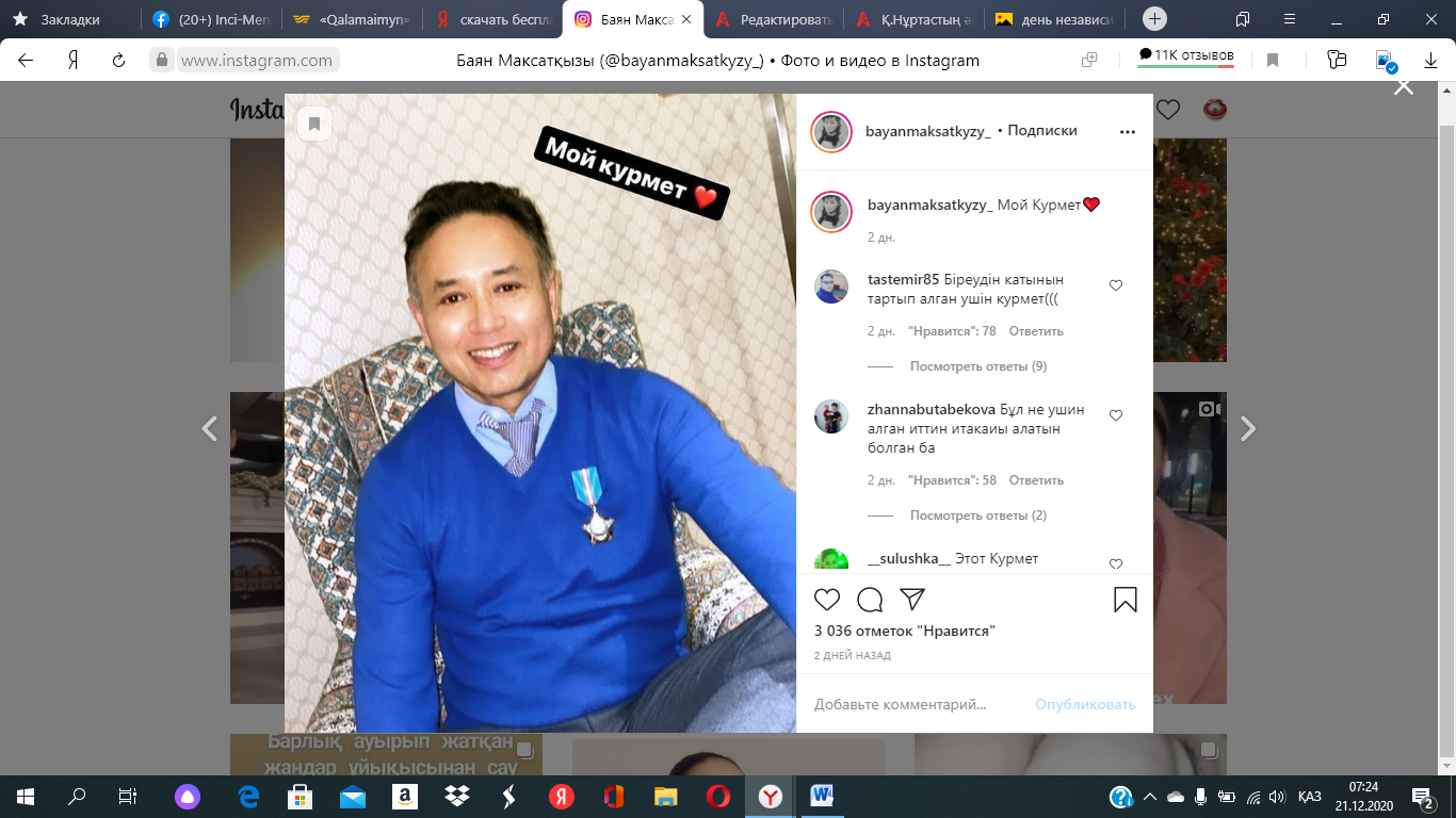 ينستاگرام الەۋمەتتىك جەلىسىندە ءارتىس بايان ماقساتقىزى الاگوزوۆا جۇبايى تۇرسىن الاگوزوۆكە «قۇرمەت» اتاعىن بەرگەنىن جازدى. «موي كۋرمەت» دەپ «قۇرمەت» توسبەلگىسىن تاققان تۇرسىننىڭ فوتوسىن جاريالاعانى سول ەكەن، وقىرماندارى سۇراقتىڭ استىنا الىپ، سىني پىكىردى قارشا بوراتتى.