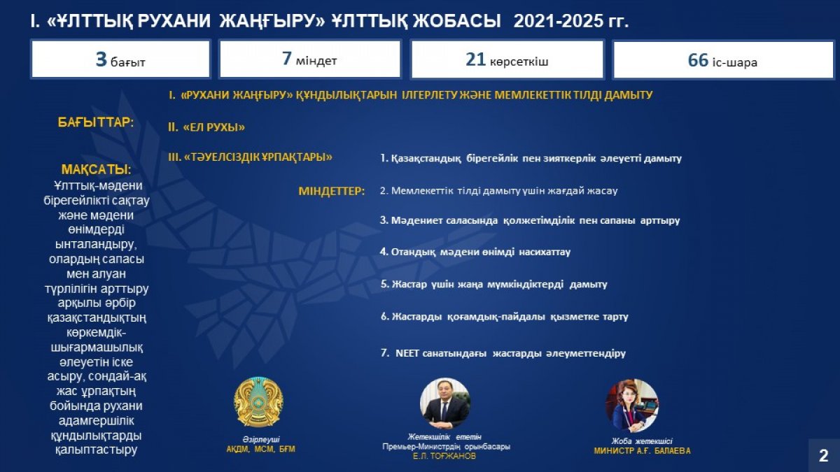 ونلاين كەزدەسۋدە جوبانىڭ باعىتى، ماقساتى، مىندەتتەرى جانە ىسكە اسىرۋ تەتىكتەرى تانىستىرىلدى. ۇلتتىق جوبانىڭ ءبىرىنشى باعىتى «رۋحاني جاڭعىرۋ» قۇندىلىقتارىن ىلگەرىلەتۋ جانە مەملەكەتتىك ءتىلدى دامىتۋ» باعىتى. بۇل باعىت بويىنشا 38 ءىس-شارا، 8 كورسەتكىش كوزدەلگەن. ەكىنشى «ەل رۋحى» باعىتى – مادەنيەت سالاسىندا قولجەتىمدىلىك پەن ساپانى ارتتىرۋ، 13 ءىس-شارا مەن 5 كورسەتكىشكە جەتۋ جوسپارلانعان. ءۇشىنشى «تاۋەلسىزدىك ۇرپاقتارى» باعىتى. بۇل – جاستار ءۇشىن جاڭا مۇمكىندىكتەر اشۋ جانە ولاردى قوعامدىق پايدالى ىستەرگە تارتۋ مىندەتتەرىن قامتيدى.