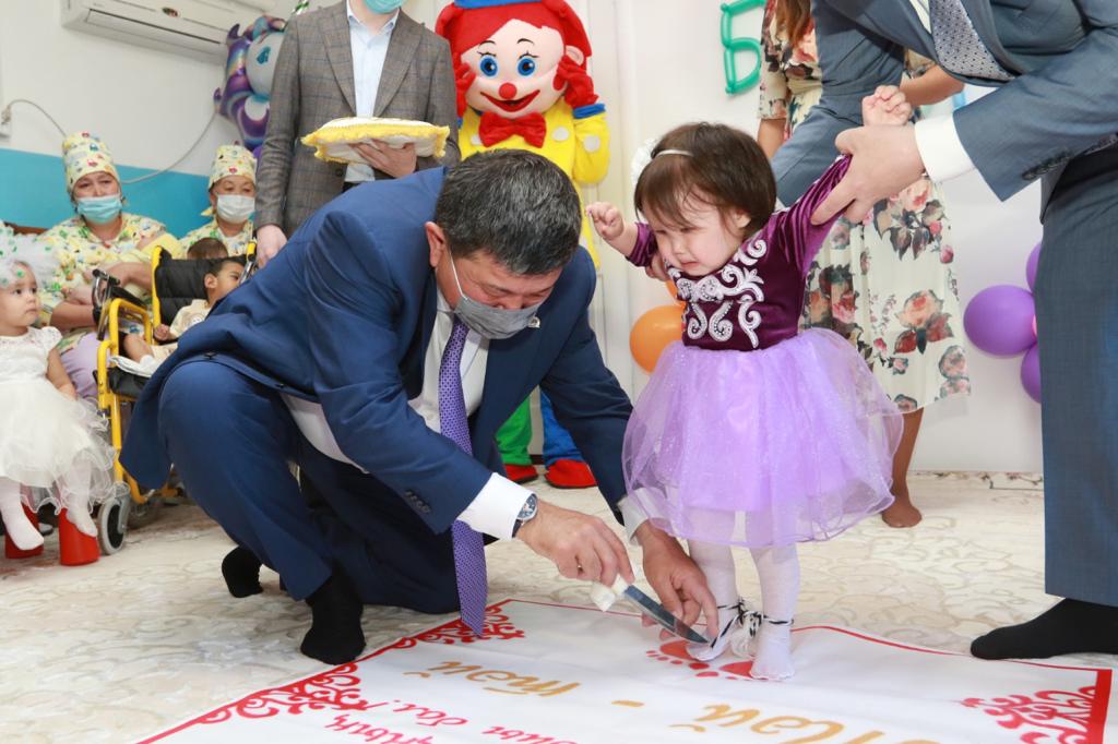 Одан кейін аймақ басшысы бүлдіршіндер өз өнерін ортаға салған «Біз өмірдің гүліміз» атты концерттік іс-шараның бірнеше нөмірін тамашалады. Одан соң балалардың қандай жағдайда тұрып жатқанымен танысып, әлеуметтік мекеменің басшылығымен әңгімелесті. Әлеуметтік мекеменің басшысы Раиса Баймұханованың сөзінше, қазіргі кезде мұнда түрлі ауруға шалдыққан, 4 жасқа дейінгі 23 бүлдіршін тәрбие алуда. Балалар орталық нерв жүйесінің зақымдануы, сөйлеу тілі дамуының тежелуі және ДЦП ауруларымен ауырады. Ал әлеуметтік мекеменің 50 қызметкері сәбилерді сапалы және уақтылы күтім-бағыммен қамтамасыз етіп отыр. «Бұл мереке ұрпақтың жан-жақты дамуына жауап беретін қызметкерлер үшін де өте маңызды. Бақытты және Тәуелсіз еліміздің мақтанышына айнала алатын ұрпақ тәрбиелеу сынды зор жауапкершілікті жете сезінетіндеріңізге сенемін. Осы бағыттағы ерен еңбектеріңіз үшін әрқайсыңызға арнайы алғысымды білдермін»,-деп аймақ басшысы әлеуметтік мекеменің қызметкерлеріне де ризашылығын білдірді. Балалар мерекесіне орай тәрбиеленуші бүлдіршіндерге облыс әкімі атынан сыйлықтар берілді. Соңғы жылы мамандандырылған балалар үйінің бір тәрбиеленушісін отбасы асырап алса, алтауы өздерінің туған үйлеріне оралған, бір бала отбасылық үлгідегі "Шаңырак" балалар ауылына ауыстырылыпты.
