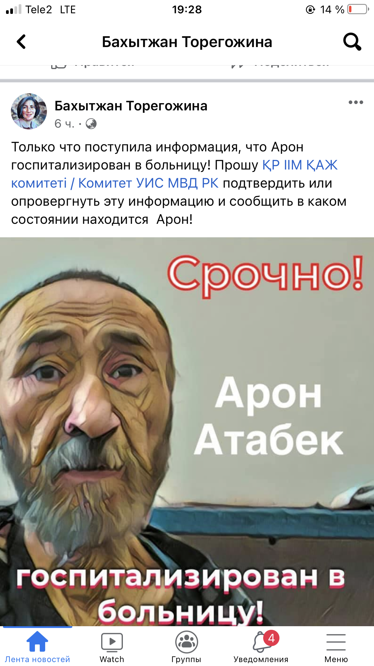 Құқық қорғаушы Бақытжан Төреғожина түрмедегі диссидент Арон Атабектің ауруханаға түскені туралы хабар алғанын мәлімдеді. Бұл туралы ол Facebook желісінде жазды, деп хабарлайды «Адырна» тілшісі. «Жаңа ғана Аронның ауруханаға жатқызылғаны туралы ақпарат келді! ҚР ІІМ ҚАЖ комитетінен ақпаратты растауды яки терістеуді, сондай-ақ А.Атабектің жағдайы туралы жазуды өтінемін»,– деді Төреғожина.   Айта кетейік, бұған дейін БАҚ бірнеше мәрте ақынның халі мүшкіл екенін жазған еді.